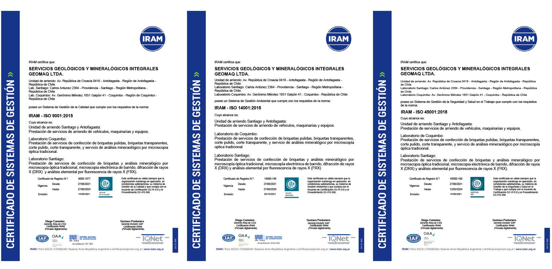 Esta es una decisión estratégica para mejorar continuamente el desempeño en nuestras diferentes unidades de negocio, proporcionando una base sólida para fundamentar el desarrollo sostenible de la empresa y lograr la satisfacción de nuestros grupos de interés, siendo esto verificado y certificado por IRAM CHILE S. A. con validez tanto a nivel nacional como internacional.